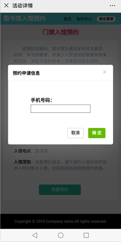 第四步、点击“我要预约”,输入手机号,确定即可申请成功。