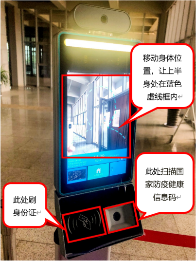 3、请读者在入口的专用机器上刷身份证或者扫描国家防疫健康信息码(国家防疫健康信息码位置在苏康码的左下角),经体温检测正常后,持本人校园一卡通刷卡入馆。